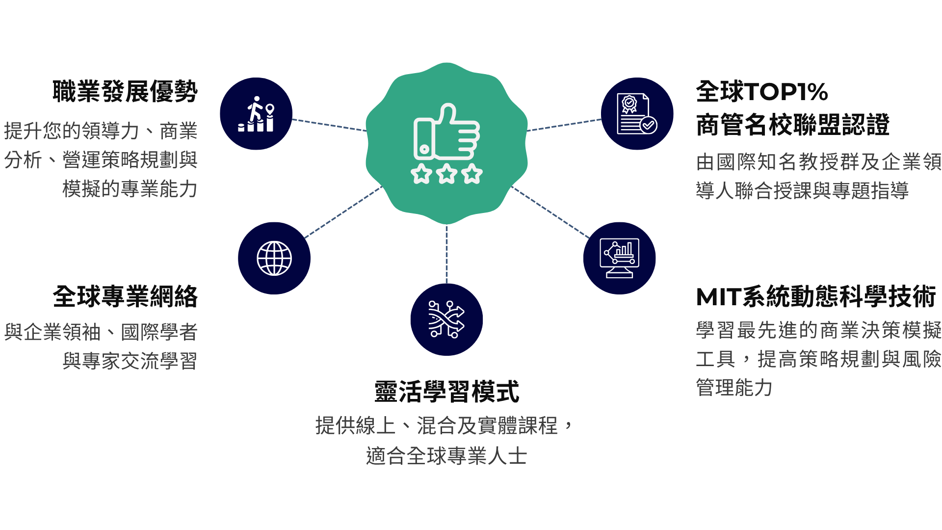 透過真實企業案例、ESG 策略與創新商業模式訓練,讓您能即學即用,創造產業創新影響力。