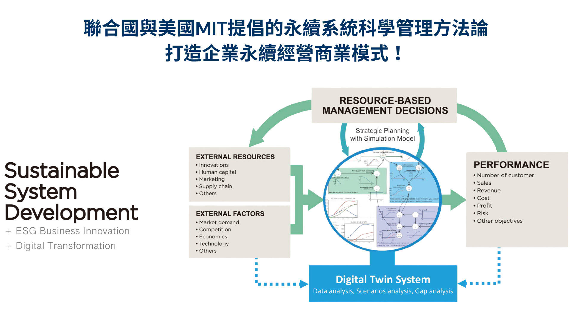 面對產業環境不確定性以及企業經營及組織管理的動態複雜性,為全面提昇管理心智模式與卓越成長的經營管理適應能力,企業需要可視化的動態決策模擬即時反應現況並提供最適解方。SSD永續系統發展管理技術與策略動態學結合系統思考與動態情境的電腦模擬分析專業,培養企業經營策略之系統思考邏輯與決策整合能力。