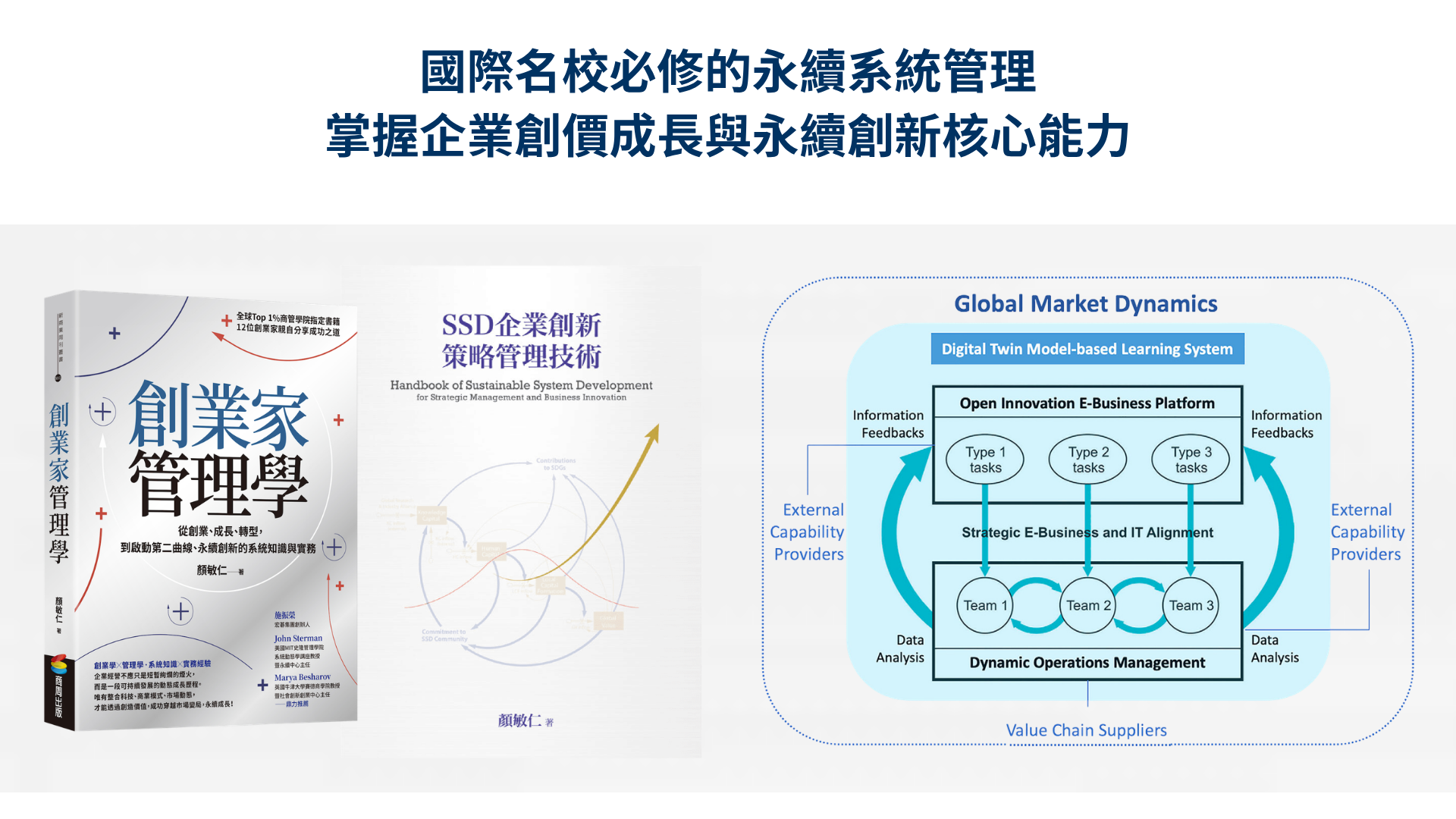 顏教授長期關注、參與教育及社會服務工作,協助政府與國際機構進行國家治理與產業發展政策規劃研究與創新計畫推動。他亦為SSCI 國際學術期刊《知識管理研究與實踐》(KMRP)及《卓越經營管理》(MBE)亞洲主編,發表許多國際專業書籍及論文著述。著有《策略動態學核心原理》、《SSD企業創新策略管理技術》、《SSD 數位賦能永續發展教育》、《Transforming Manufacturing 》(製造經濟轉型)、《New Dynamics of Global Supply Chain Systems 》(全球供應鏈系統動態新經濟)、《Digital Works 》(數位經濟工作)等書。